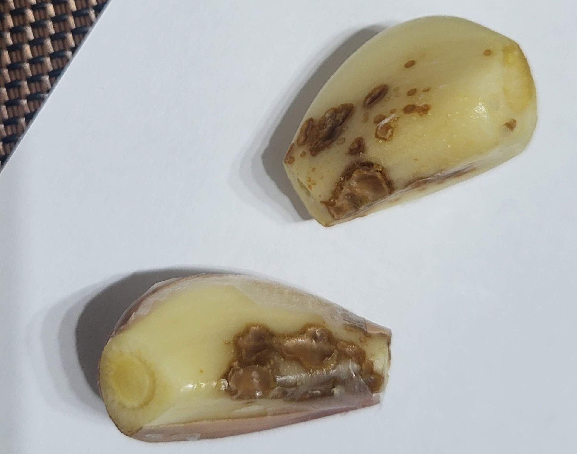 poprosím, jestli je to takto možné, o určení choroby na stroužcích česneku, která se mi objevuje cca druhým rokem. Popřípadě radu jak se toho zbavit. Pěstujeme zhruba 400 palic, vyskytuje se to na zhruba každé třetí palici a skoro u všech stroužků v palici. Pěstuji tři odrůdy - velký ruský paličák, Dukát a Velkého Karla.